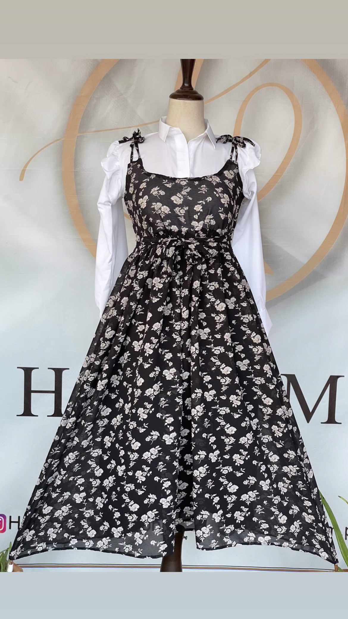 A timeless black pinafore dress featuring delicate white floral patterns, designed for effortless elegance. This flowy maxi dress is paired with a crisp white ruffled shirt for a sophisticated and modest layered look. The dress is enhanced with ribbon-tie shoulder straps and a matching waist belt for a customizable fit. Perfect for formal gatherings, casual outings, or evening wear, this chic and stylish outfit is a must-