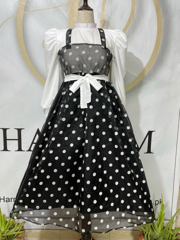 Embrace timeless elegance with this black & white polka dot organza dress, featuring a stylish pinafore design over a white puff-sleeve blouse. The sheer organza overlay adds a delicate touch, while the waist-cinching white ribbon creates a flattering silhouette. Perfect for casual outings, vintage-themed events, and elegant daywear.