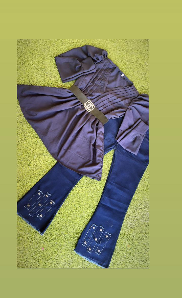 Paired with navy designer jeans adorned with gold-tone button patchwork on the flared hems, this combo blends luxury and trend in perfect harmony. Ideal for casual brunches, fashion-forward events, or smart casual wear. ✨💃