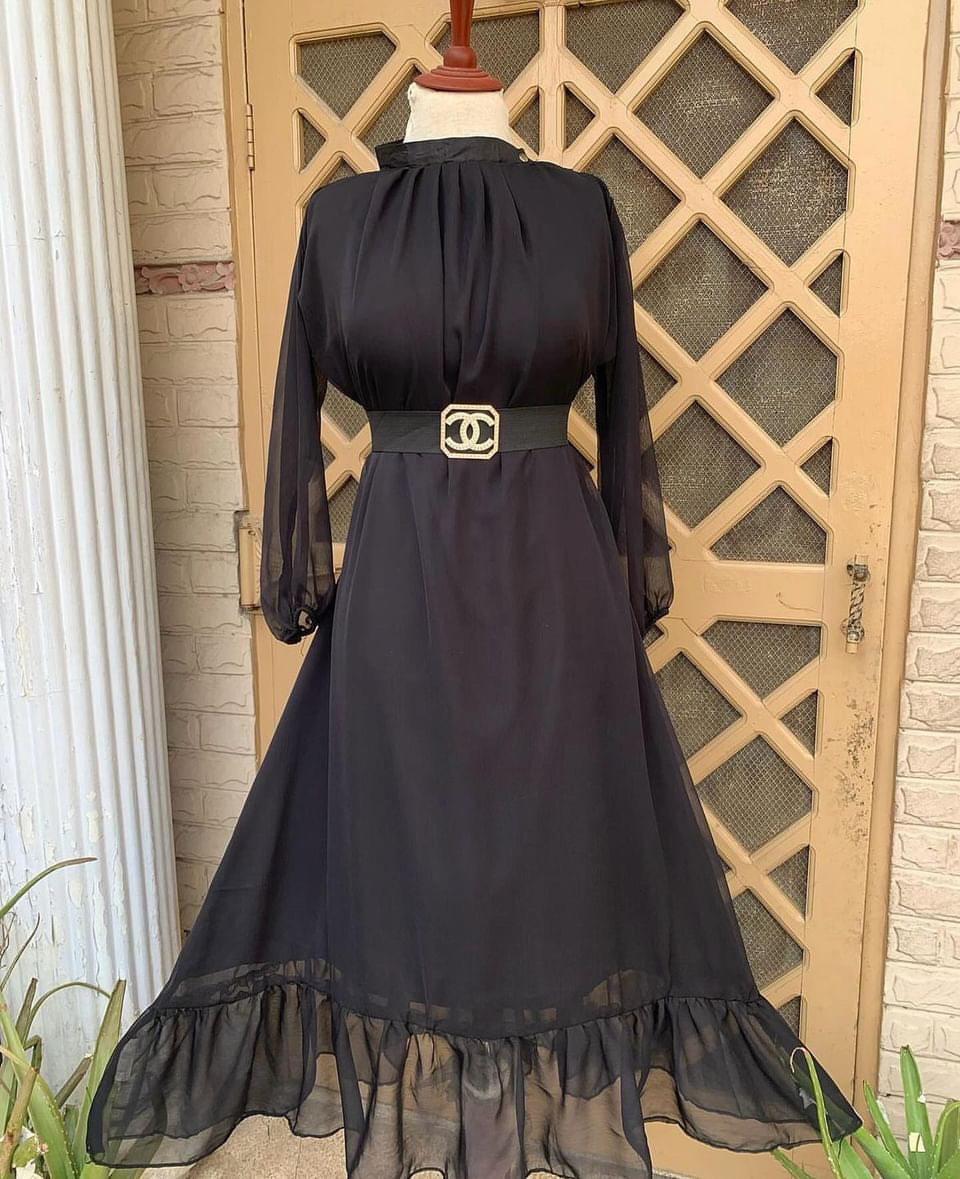 Turn heads with this breathtaking black chiffon maxi, crafted for a sophisticated and graceful look. The high neckline and gathered bodice provide a regal touch, while the sheer full-length sleeves add a delicate charm. The flowy skirt with a ruffled hem enhances the silhouette, making it a perfect choice for evening events, formal gatherings, and special occasions. The waist belt with a chic statement buckle defines the waist beautifully.