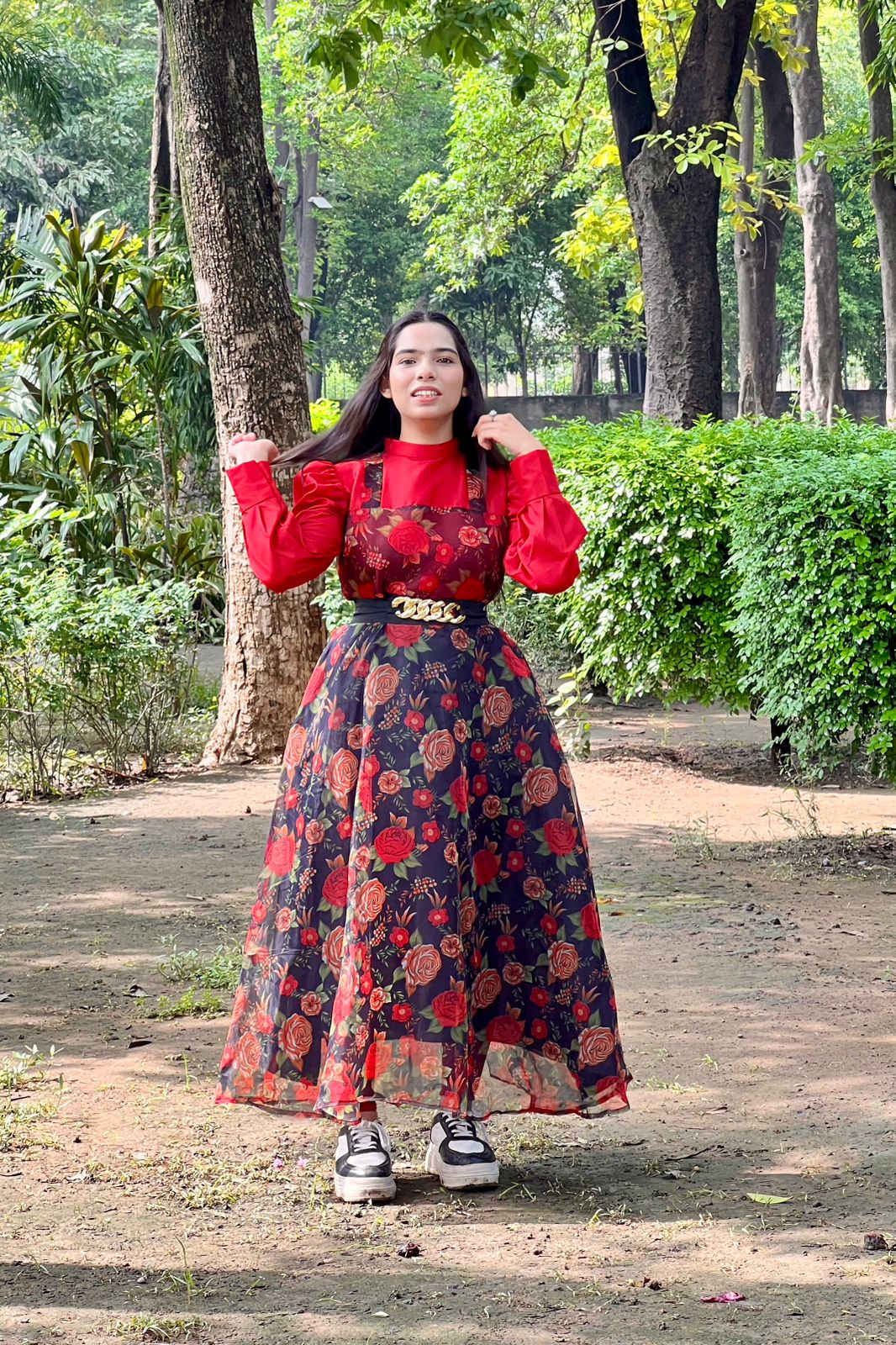 Make a bold statement with this stunning black organza dress adorned with vibrant red floral prints. The puff-sleeve red blouse adds a dramatic yet elegant touch, while the gold-chain belt enhances the waistline for a flattering silhouette. This flowy and graceful dress is perfect for formal gatherings, festive occasions, and evening wear.