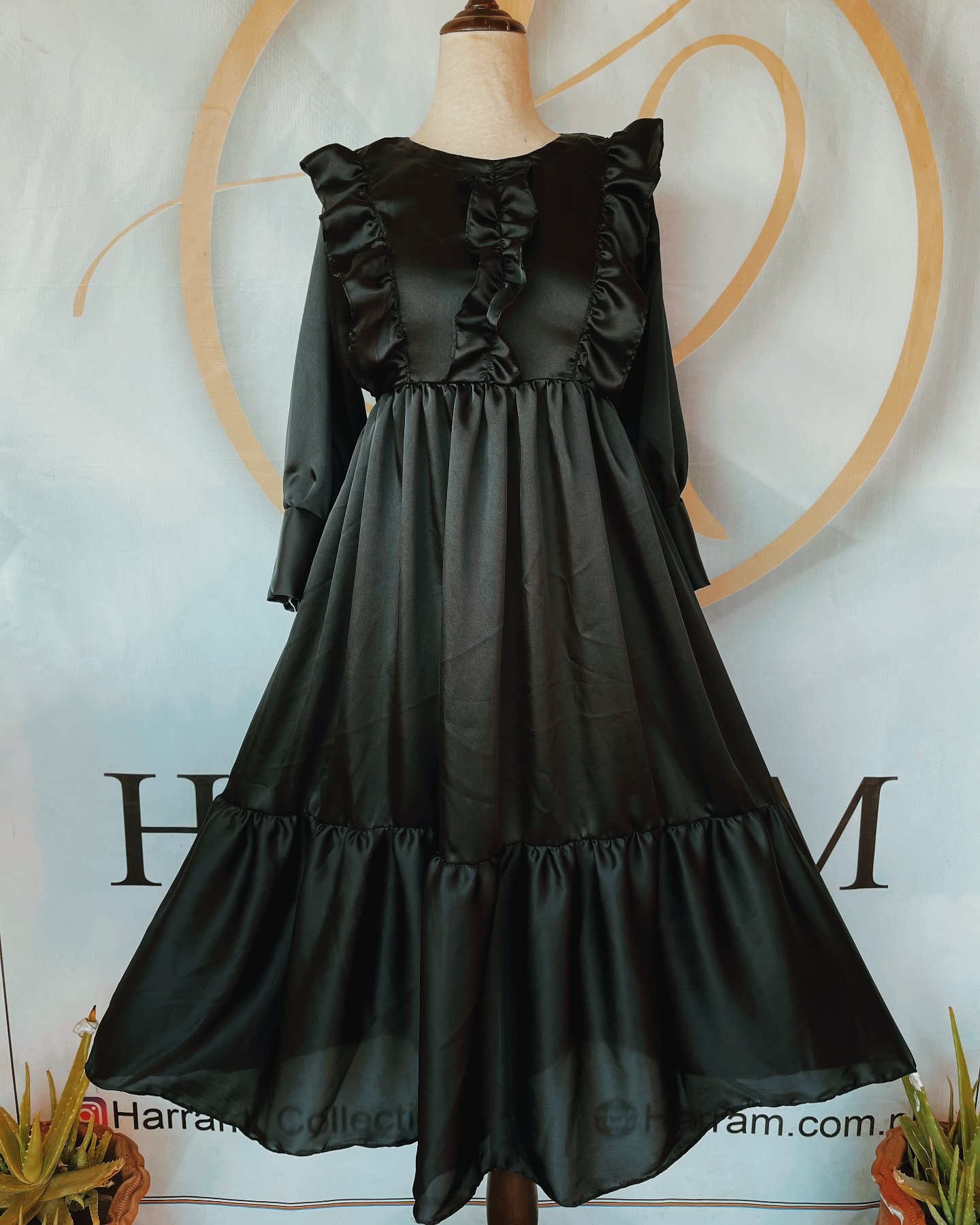 🌟 Design: The dress features a sleek satin finish with beautiful ruffle detailing on the front and shoulders for a touch of drama and femininity.