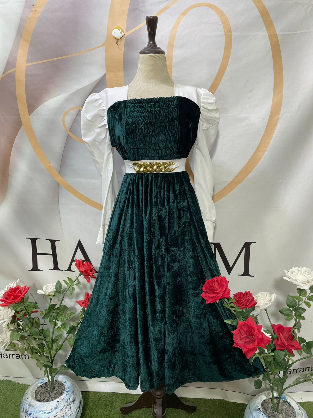 Emerald Green Velvet Smocked Frock with Contrast White Puff Sleeves – Winter Party Dress
