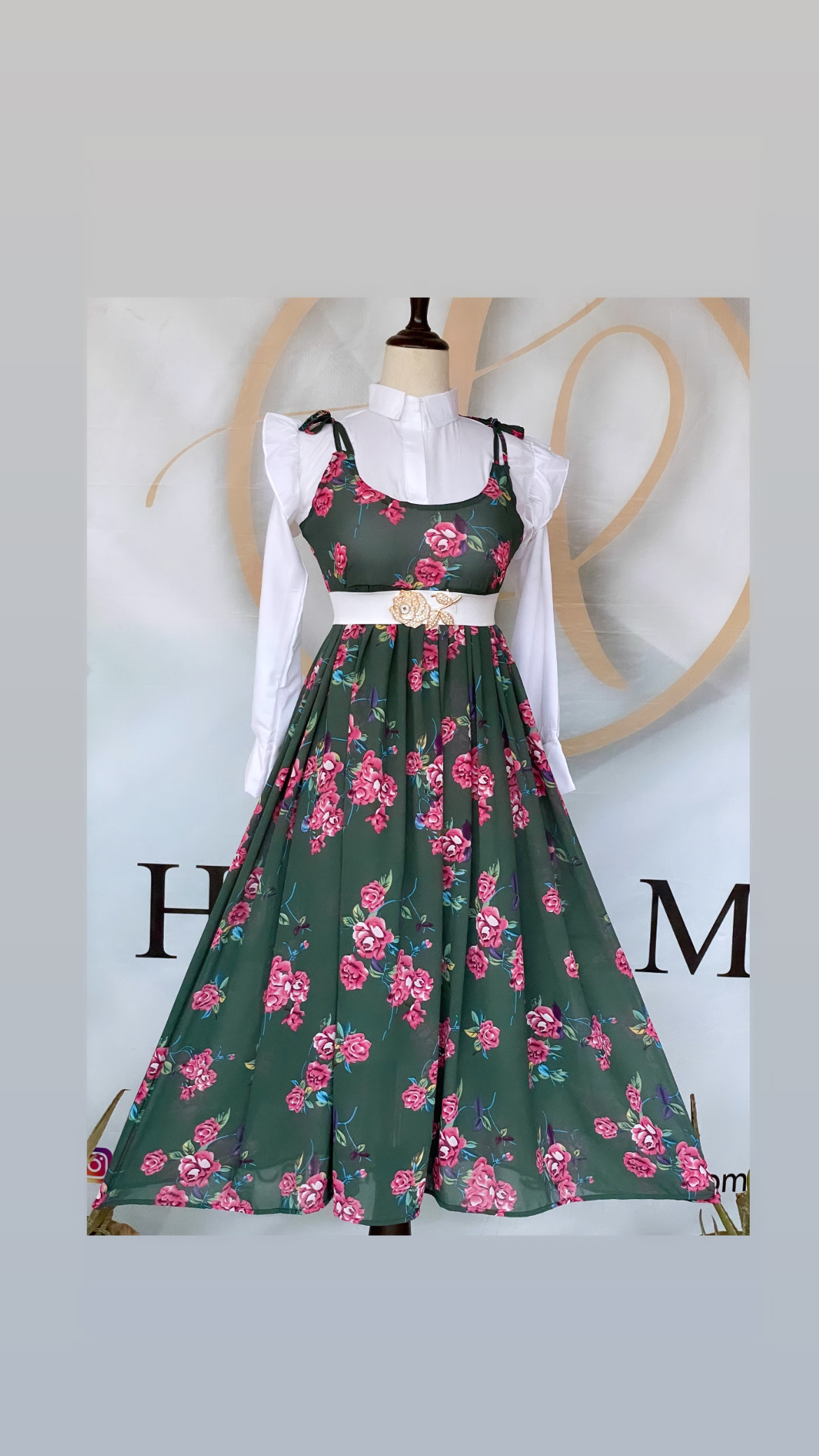 Green Floral Pinafore Dress with White Ruffled Shirt