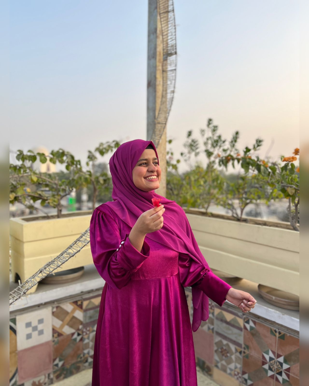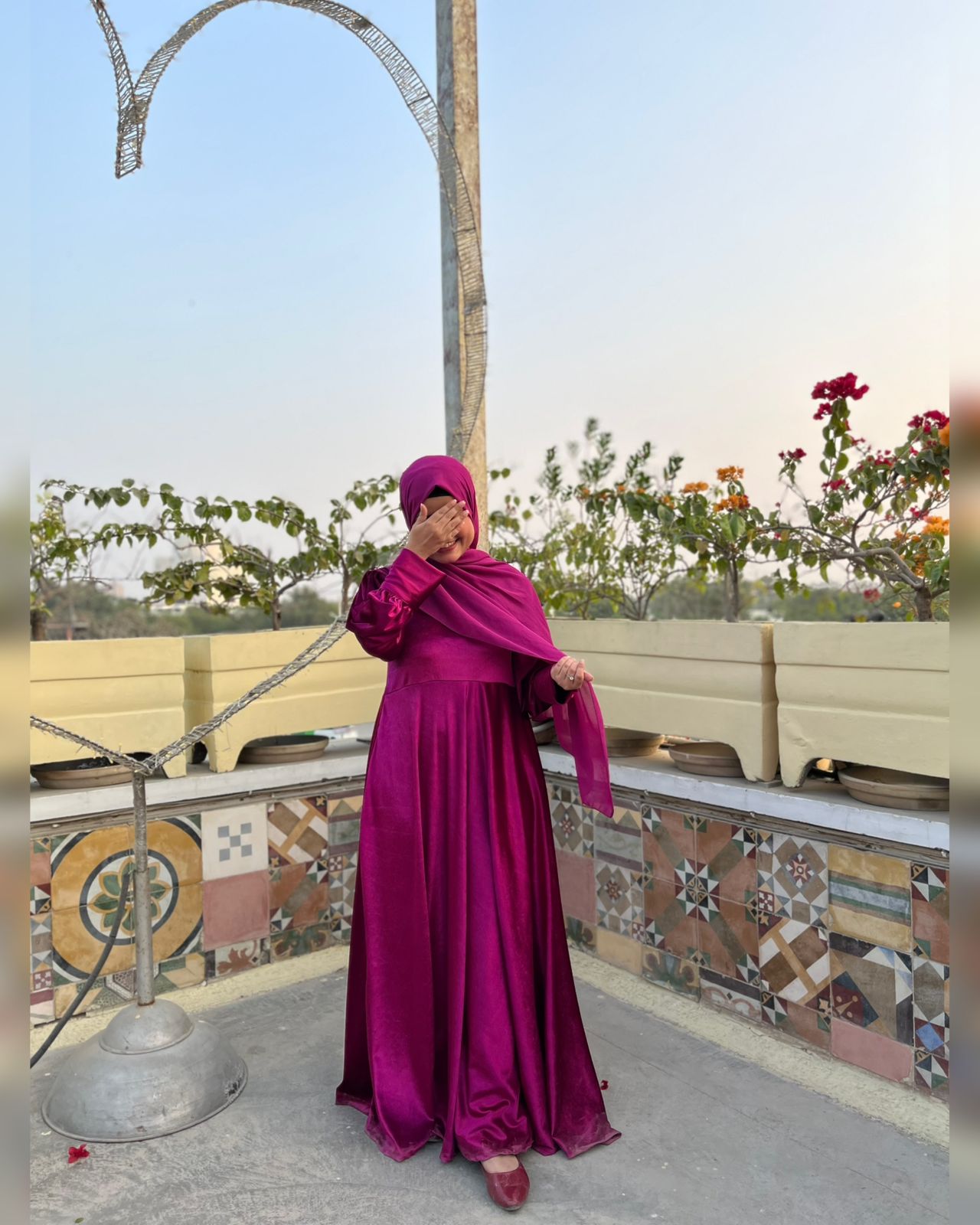 “Harram.com.pk ka naya Plum Velvet Modesty Maxi Gownโ sardiyon ki shaam aur taqreebat ke liye misali. Is naram aur shandar Velvet libas mein aap behtareen aur ba-haya nazar aayen gi. Is ki Royal Magenta rangat aur behta hua design aap ki shakhsiyat mein shahi andaz laye ga. Poori aasteenon aur aaraam de fit ke saath, yeh gown aap ko garmi aur style dono faraham karta hai. Isay hijab ke saath ya baghair pehna ja sakta hai. Limited Stock! Aaj hi order kijiye.”