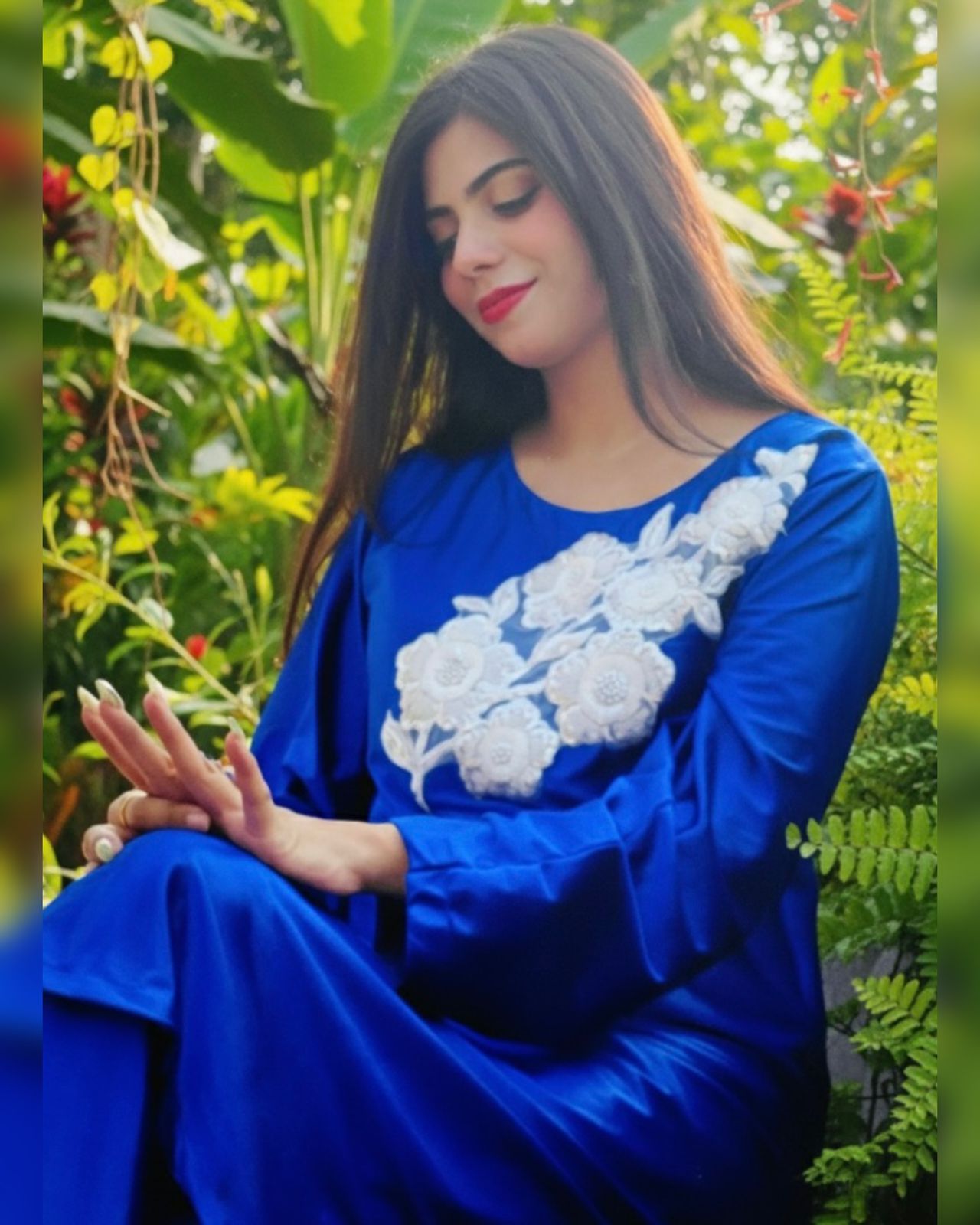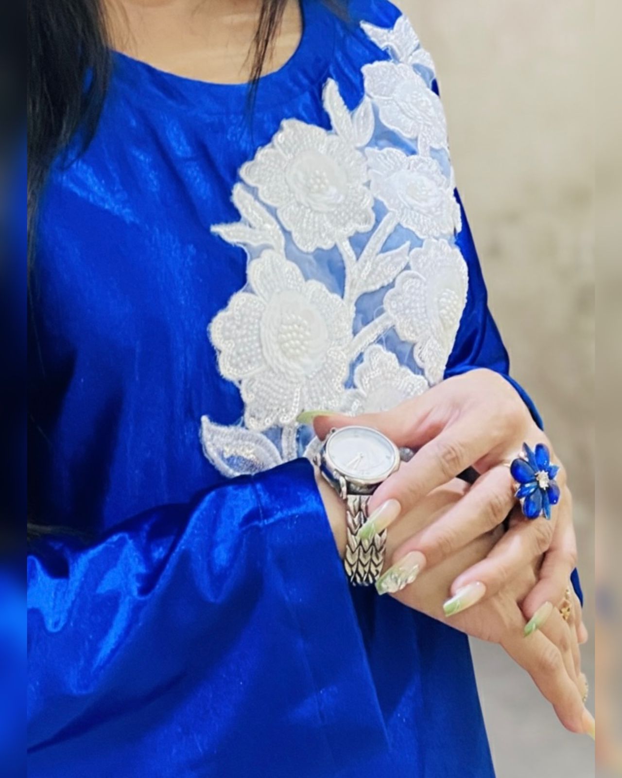 Unique Floral Applique: Chest aur shoulder par white fabric se bana hua haseen phoolon ka kaam (applique) hai.