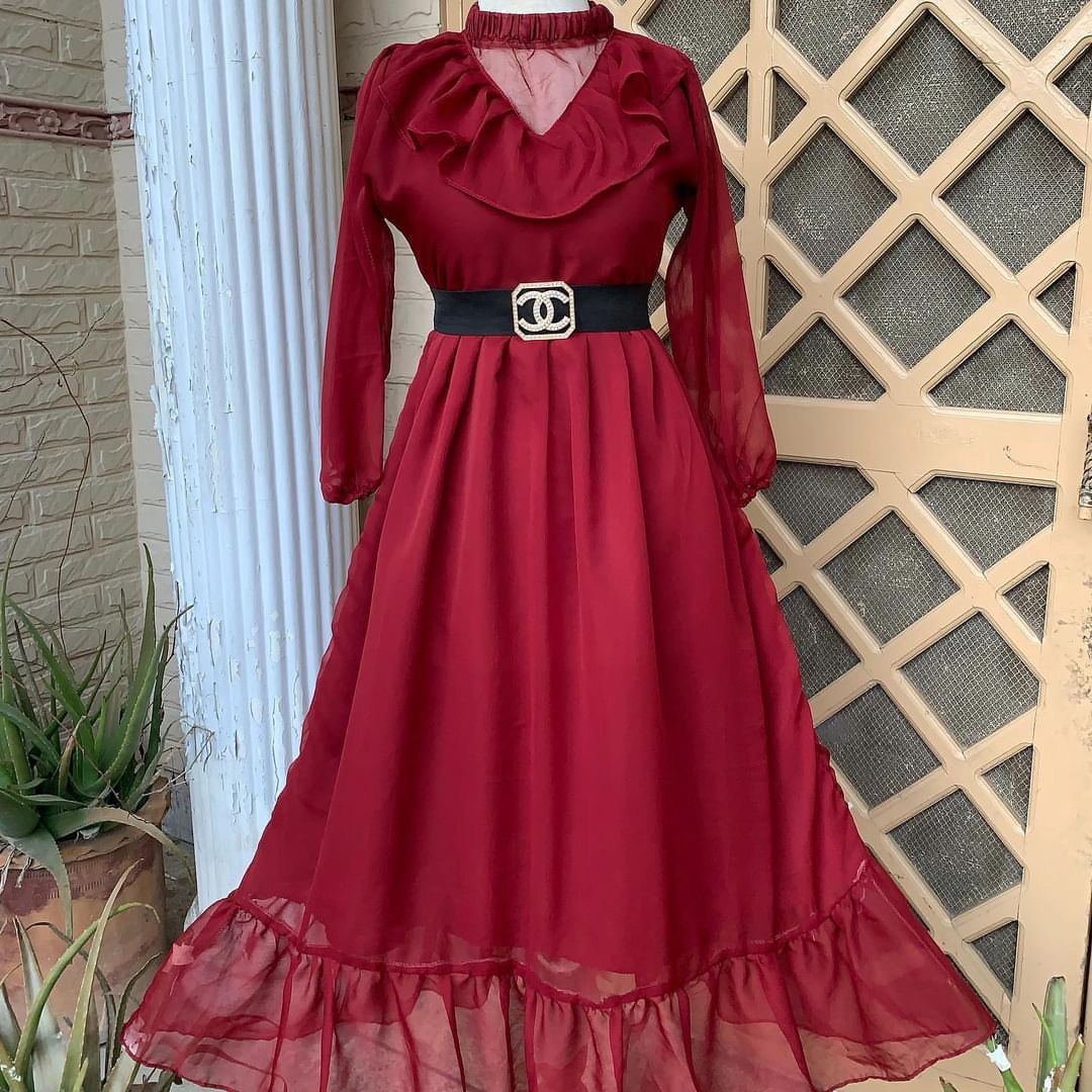 Make a bold statement with this exquisite maroon chiffon maxi. Featuring delicate ruffle detailing at the neckline, a high-neck design, and sheer full sleeves, this dress radiates elegance and charm. The cinched waist is beautifully accentuated with a stylish belt, enhancing your silhouette. The flowy chiffon fabric and ruffled hemline add a touch of femininity, making it the perfect choice for formal events, evening wear, and wedding festivities.