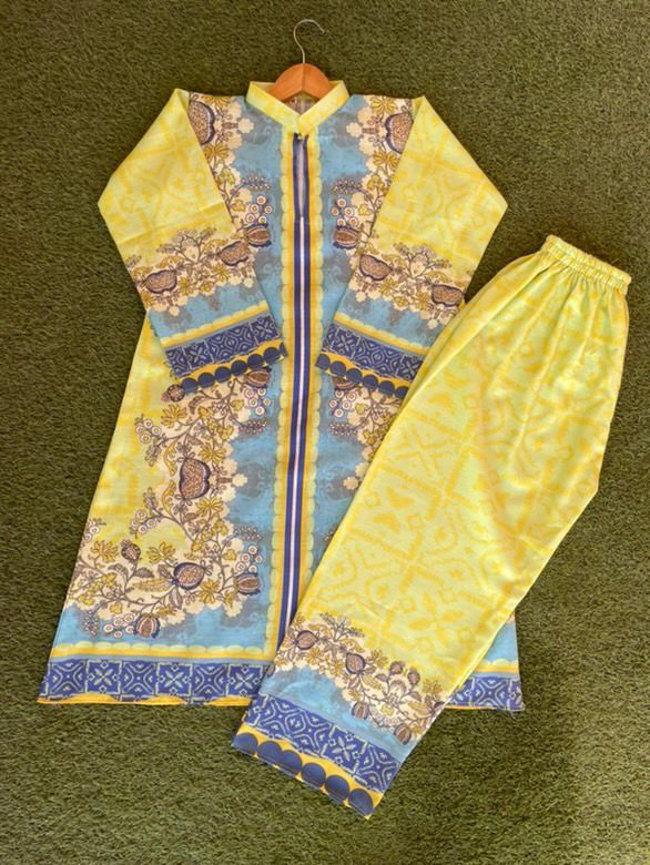 This stunning 2-piece outfit is crafted from premium fabric, offering both comfort and style. The long shirt features intricate floral and geometric prints in soft yellow and blue tones, paired with a matching trouser for a complete look. Whether for casual outings or relaxed homewear, this outfit ensures effortless elegance.